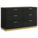 Build a modern bedroom oasis with the chic style and impressive simplicity of a contemporary bedroom set. The set offers abundant storage in various drawers, with a chic two-tone finish complete with bar drawer pulls and metallic kickplates that add dimension. The centerpiece of the set is a streamlined bed design complete with an upholstered headboard. Light gray fabric is lightly padded, offering impressive comfort for lounging. Built-in LED strip lighting surrounds the upholstered panel and is operated with a touch switch for easy, inviting ambiance and a low-profile footboard completes the look with, airy, modern appeal.