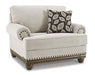 True classic character comes to life in this oversized chair with room for two to sit. Set back pleated rolled arms and warm brown exposed frame with bun feet are beautifully traditional. Lovely detailing carries itself through the herringbone weave in the soft upholstery. Seat cushion reverses to maintain durable comfort. Vintage-inspired jumbo nailhead trim graces the design. Botanical pillow in dark brown is a timeless touch.