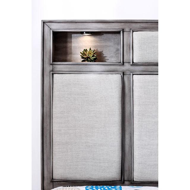 DAPHNE Gray Queen Bed, 87 3/4"L X 65 1/4"W X 58"H, 127.05lbs. In addition to stunning carved details and felt-lined top drawers, this transitional style bedroom collection comes with built-in headboard shelves and convenient touch lights. An extra drawer hides within the nightstand and dresser while the chest o ffers extra functionality with its lift-top jewelry storage, complete with mirror. Sleek silver tone handles sparkle against the weathered gray finish for a beautifully contemporary design that will beautify any bedroom. Features: Transitional Style Padded Fabric Headboard Built-in Touch Light in Headboard Hidden Drawer in Night Stand and Dresser Double Drawer Fronts Felt-lined Top Drawers Solid Wood, Wood Veneer, Others Gray Finish