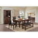 MEAGAN I Brown Cherry Dining Table, 78"L X 42"W X 30"H, 189.2lbs. Parson style chairs and a plank style table top blend to create a contemporary design with rustic appeal. The open bottom shelf provides an interesting visual while providing useful storage space. The flared chairs are upholstered in sleek leatherett e upholstery to combine trending style with modern comfort. Features: Transitional Style Plank Design Open Bottom Shelf Tapered Legs Padded Leatherette Cushions Matching Wine Cabinet Solid Wood, Wood Veneer, Others Brown Cherry Finish