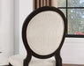 Add luxury to your decor with this visually stunning dining ensemble. Wooden frames are finished in dark espresso while the chairs feature contrasting bright, ivory fabric. The chairs complement perfectly, with slightly curved round backs and padded seats upholstered in 100% polyester.