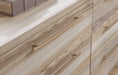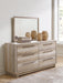 Modern meets neutral and sophisticated in this dresser with mirror. Its natural finish, subtle replicated wood grain and clean lines wake up your bedroom with eye-catching appeal. The generous storage space in its smooth-gliding, lined drawers brings function to relaxed refinement. Elongated handles in a champagne tone speak casual simplicity, creating a smart and stylish bedroom retreat.