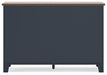 - Two-tone finish features a dark slate blue with light brown wood-tone top