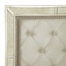 LORAINE E.King Bed, 88"L X 80 1/4"W X 68"H, 285.12lbs. This is what luxury feels and looks like in the bedroom. The padded leatherette headboard and footboard are beautifully complemented by antique mirror borders, which are also found on the case goods' front panels. Stylish details like the nailhead trim and button tufting, ring drawer pulls on the case goods drawers, and silver finish all add polish to this sophisticated bedroom set.