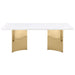 Instill a sense of luxury with this striking contemporary dining table, featuring a genuine white marble tabletop. The rectangular table, constructed with engineered marble veneer, china white marble, and MDF, comfortably seats friends and family, offering a fresh, modern look. Brimming with elegance, the table showcases the white marble to perfection, allowing its natural veining to create a rich, refined character. Adding a touch of glamour, the table is supported by a double pedestal base, each pedestal being a curvy, three-sided structure made of champagne gold stainless steel. This stunner is an exceptional focal point in any sophisticated dining room.