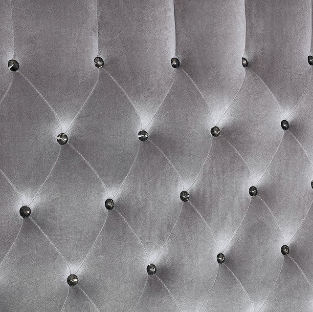 Alzir Gray Queen Bed, 88 1/8"L X 87 1/2"W X 66"H, 253lbs. Comforting cushioned flannelette encompasses this chic gray bedroom set. Admire the glamorous wingback headboard as glimmering acrylic button tufts and framing nailhead trim dazzles. Run your hands over the soothing nightstand and easily store essent ials in its storage space. Cabriole feet add a finishing polish as they provide unwavering support to this elegant bedroom set. Features: Traditional Style Padded Flannelette Fabric Wingback Design Button Tufted w/ Nailhead Trim Felt-lined Top Drawer Solid Wood, Others Gray