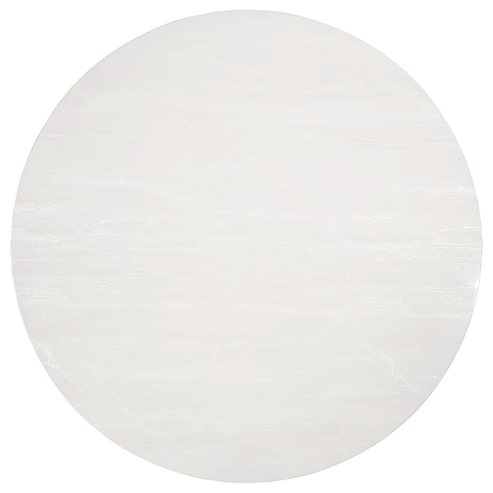 Updated style elements offer a clean look with a wow factor to your contemporary dining room or kitchen with this modern round dining table. A bit on the casual side of glam, this table and its round top fill a need for space-conscious configurations as well as modern optical impact associated with circular shapes. A clean China white top made of genuine marble with engineered marble veneer is slender and sophisticated, perfect for bridging design motifs. Embrace a geometric-inspired gold stainless steel base that becomes a focal point for its brilliance and silhouette. Dress up this chic round table with compatible chairs and accessories that turn your home into a veritable furniture gallery.
