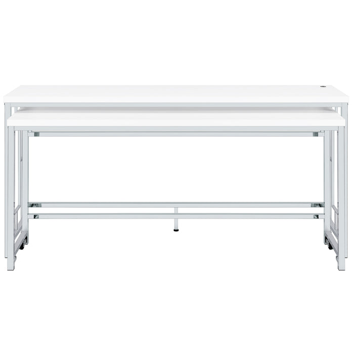 We love this modern five-piece counter height dining set in place of a console behind a floating sofa, offering exceptional versatility and refined style in any setting. It boasts two nesting tables, each long and narrow like a sofa table, but paired with three backless stools that tuck underneath. It's the perfect spot for drinks with friends on game day, or setting yourself up to work from home on a snowy day. The silver and white set features a larger table with wheels on the smaller table to create any configuration that works for you. Stools are decorated with artistic bases with open, floating frames that add Deco flair and white faux leather upholstery over padded seats for optimal comfort.