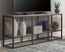 Making a great case for casual contemporary design with an urban attitude, this highly versatile TV stand is loaded with possibilities. Its cool combination of weathered replicated wood grain and linear black metal is a mastery in open-concept styling.